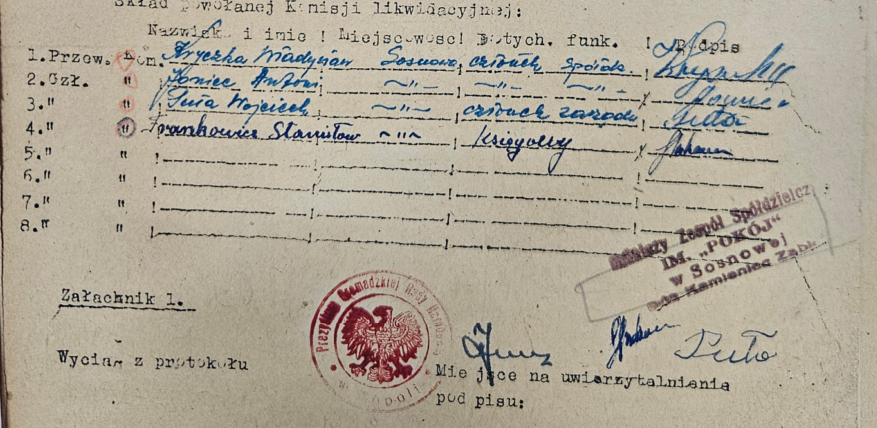 Chociaż bilans końcowy z likwidacji został sporządzony według stanu na 12 lutego 1957, przesłano go do Sądu Powiatowego w Kłodzku dopiero 17 czerwca 1959 (sam dokument utworzono 5 dni wcześniej) 9. W ten sposób oficjalnie zakończyła się działalność Spółdzielni w Sosnowej.